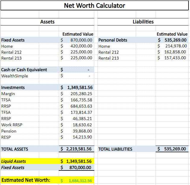 The 'Liquid Assets' cell adds up all your assets than be drawn down in retirement. When calculating your financial independence number you can't really factor in your fixed assets as they don't provide cash flow. This 'liquid assets' value will be used later to calculate your hypothetical monthly retirement income based off the 4% rule.